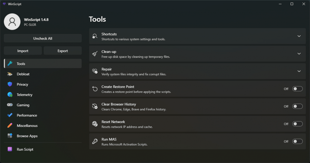 Per Windows 11 i 10 ara hi h un nou netejador de Bloadware, telemetria, software freemium, etc que es força configurable i podem guardar tots els canvis. El programa es diu Winscript i es pot descarregar d’aqueta Web: https://winscript.cc/